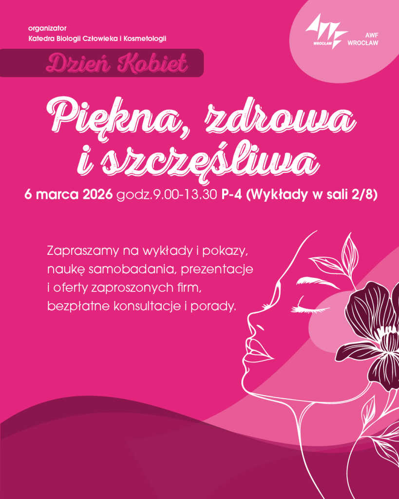 6 marca 2026 r. na Akademii Wychowania Fizycznego im. Polskich Olimpijczyk we Wrocławiu odbędzie się  IV edycja wydarzenia “Piękna, zdrowa i szczęśliwa”, organizowanego z okazji Dnia Kobiet przez Katedrę Biologii Człowieka i Kosmetologii.