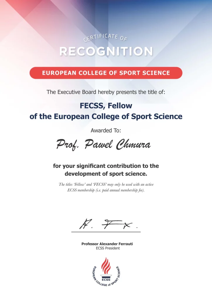 Miło nam zakomunikować, że nasz pracownik prof. Paweł Chmura otrzymał tytuł zasłużonego członka europejskiego towarzystwa nauk o sporcie – Fellow of European College of Sport Science. European College of Sport Science to organizacja non-profit, której celem jest promocja i stosowanie wielodyscyplinarne i interdyscyplinarnej nauki w sporcie, ćwiczeniach, aktywności fizycznej i zdrowiu. Została założona w 1995 r. w Nicei we Francji. ECSS organizuje coroczne kongresy, a członkami są m.in. badacze, akademicy, naukowcy, wykładowcy, trenerzy i fizjoterapeuci ze wszystkich dziedzin nauk sportowych, takich jak biomechanika i kontrola motoryczna, fizjologia i żywienie, psychologia, nauki społeczne i humanistyczne, medycyna sportowa i ćwiczenia fizyczne oraz zdrowie, stosowana nauka o sporcie i wiele innych. Wydaje również prestiżowe czasopismo European Journal of Sport Science (EJSS) znajdujące się na liście Medline i Impact Factor Europejskiego Kolegium Nauk o Sporcie, które koncentruje się na dziedzinie nauk o sporcie.