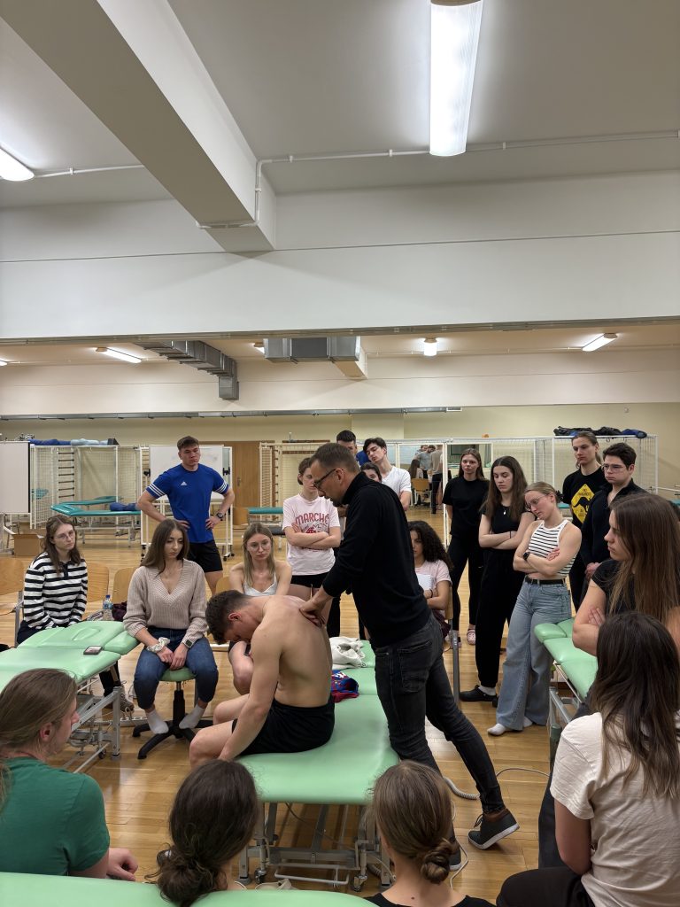 W ostatnim dniu, w czwartek 12.03, odbył się warsztat fizjoterapeutyczny pt. Terapia manualna czy terapia ruchem? Wprowadzenie do masażu tkanek głębokich jako połączenie dwóch narzędzi terapeutycznych.” Wzięło w nim udział 35 studentek i studentów kierunku fizjoterapia. Warsztat został poprowadzony przez mgr. Rafała Uryzaja, D.O., absolwenta Akademii Wychowania Fizycznego w Poznaniu na kierunku fizjoterapia oraz Akademii Osteopatii w Poznaniu, założyciela Centrum Szkoleniowego Rafała Uryzaja, autora badań naukowych i publikacji poświęconych nowoczesnej fizjoterapii oraz masażowi tkanek głębokich. Podczas warsztatu uczestnicy dowiedzieli się, że zarówno terapia manualna, jak i terapia ruchem niosą ze sobą wiele korzyści, ale posiadają również pewne ograniczenia. Oprócz elementów związanych z praktyką przedstawiono także wyniki badań naukowych, w których jednoznacznie wskazano efekty krótkoterminowe oraz długofalowe proponowanych technik. Podkreślono, że kluczem do skutecznej terapii jest odpowiednie planowanie, uwzględniające wiele aspektów, takie jak stan pacjenta, rodzaj dolegliwości, z jakimi zgłasza się on do gabinetu fizjoterapeutycznego, a także jego nastawienie do własnego stanu i procesu leczenia.